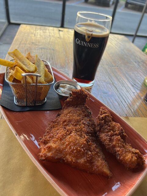 写真左:この日はアイリッシュパブでギネスとフィッシュ&チップス。