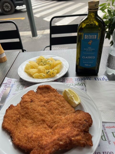 写真左:金曜日のメルカートの後に良く行くお店。このミラノ風カツレツが€6とはとっても有難い。この時にはビールで自分にお疲れさん!