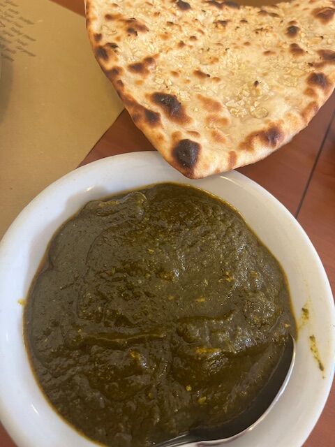 写真左:これは火曜日のメルカートの後にインドレストランで、インドビールと大好きなサグチキンをガーリックナンと一緒に。