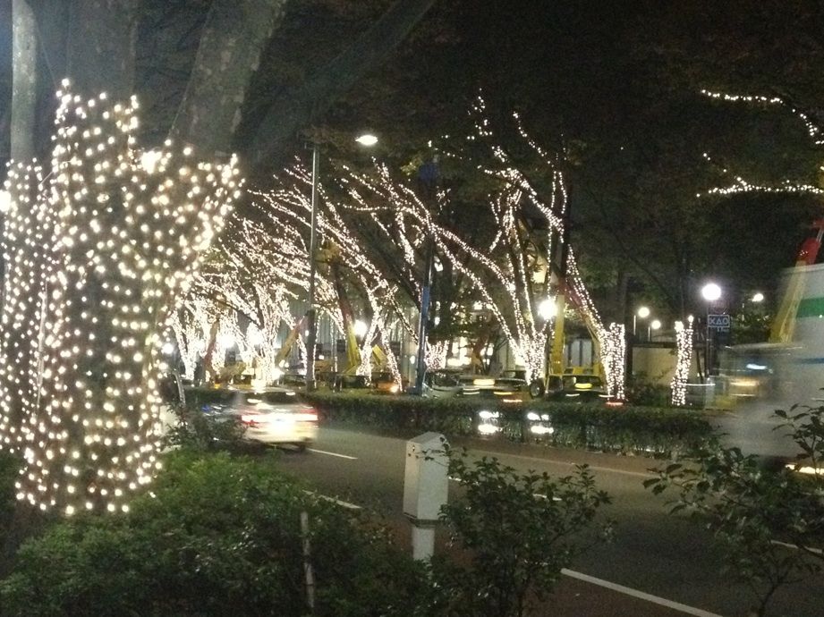 (写真右:表参道のイルミネーションのテスト?一時点灯して、今は消えています。)