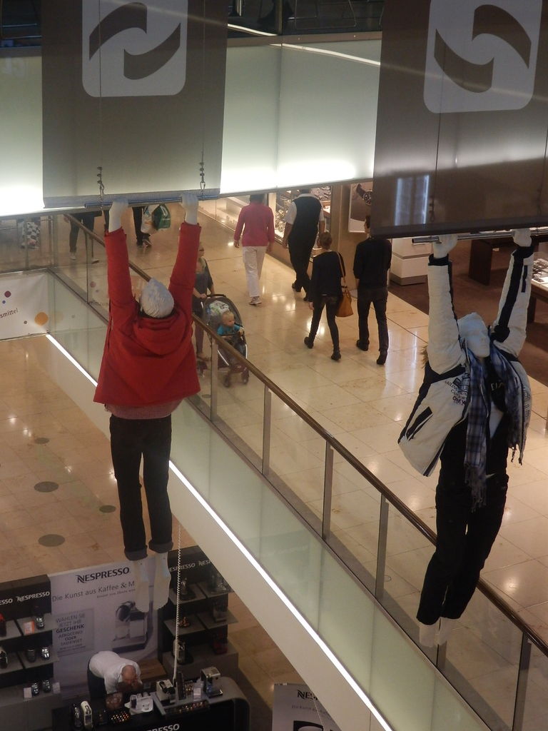 写真左右:ドイツのショッピングセンターにて。左はマネキンがぶら下がっていましたが、右は良く見ると、