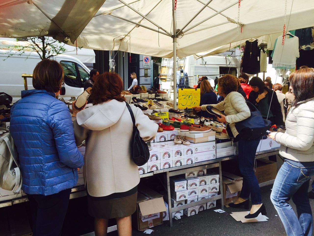 ここでのミラネーゼの皆さんのお買い物振りは、熱〜いパッションを感じるほどすごいです(写真左:安い靴屋さんでは、皆さん夢中で見ています